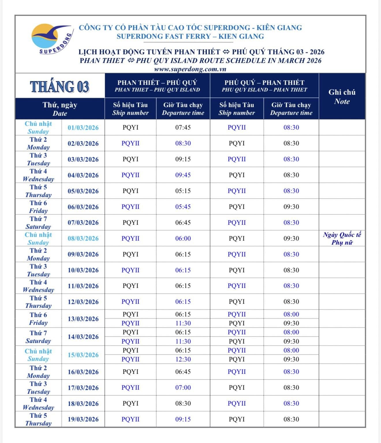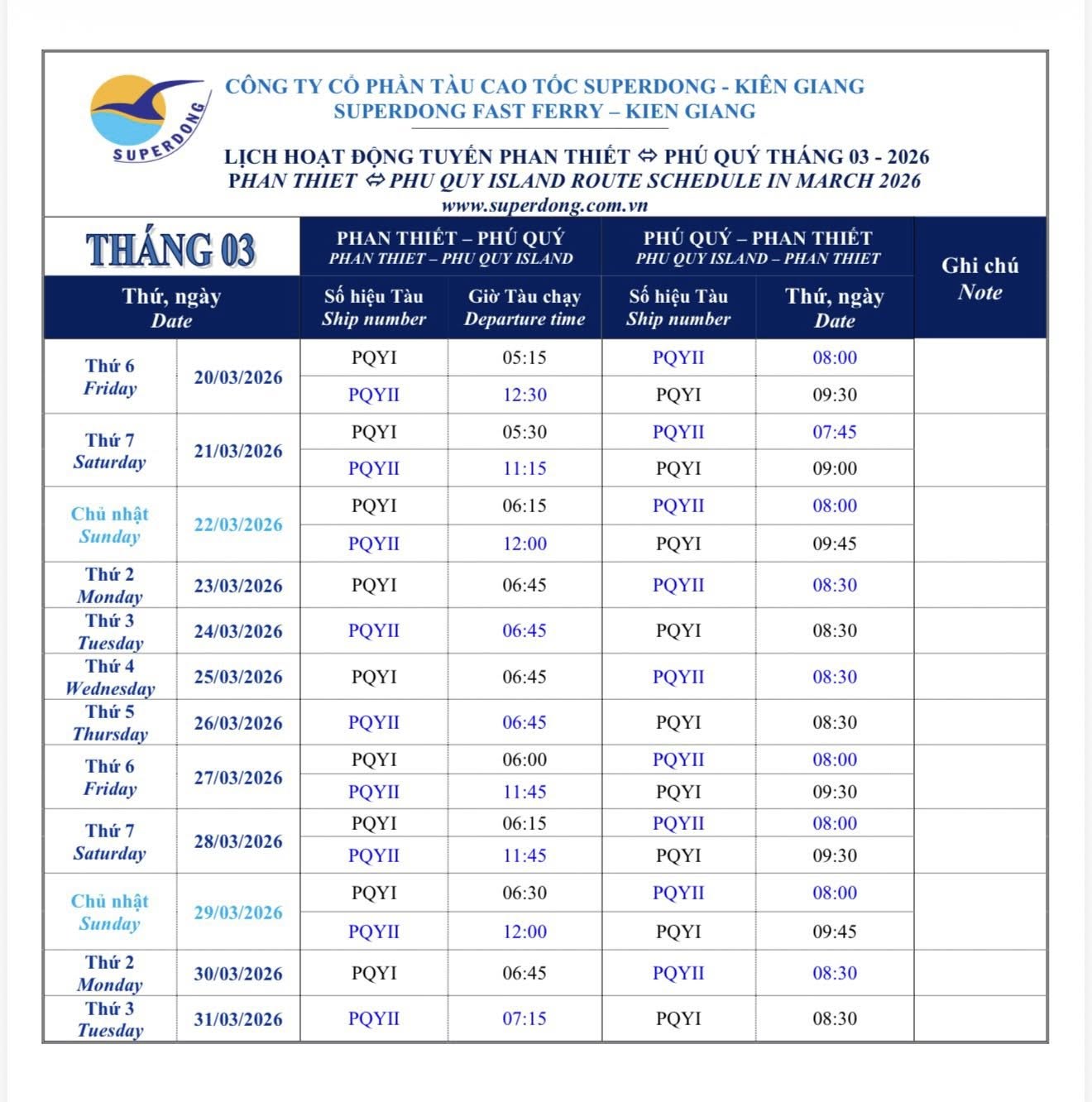 Lịch tháng 03 xem tại bảng dưới | Superdong Phú Quý I | 306 Hành khách | 26 – 28 hải lý/giờ |