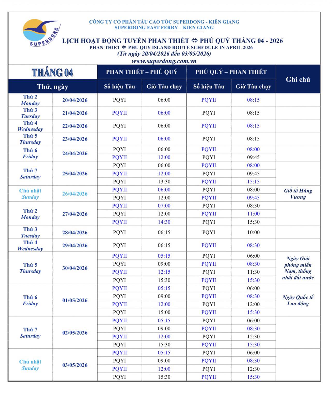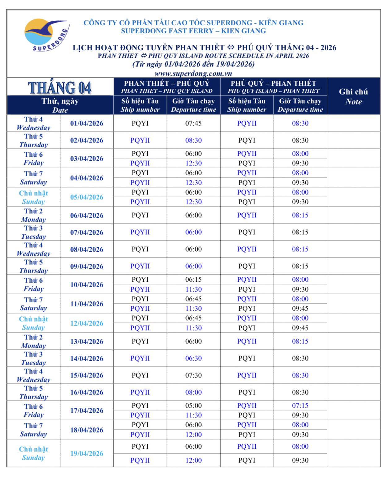 Lịch tháng 04 xem tại bảng dưới | Superdong Phú Quý I | 306 Hành khách | 26 – 28 hải lý/giờ |